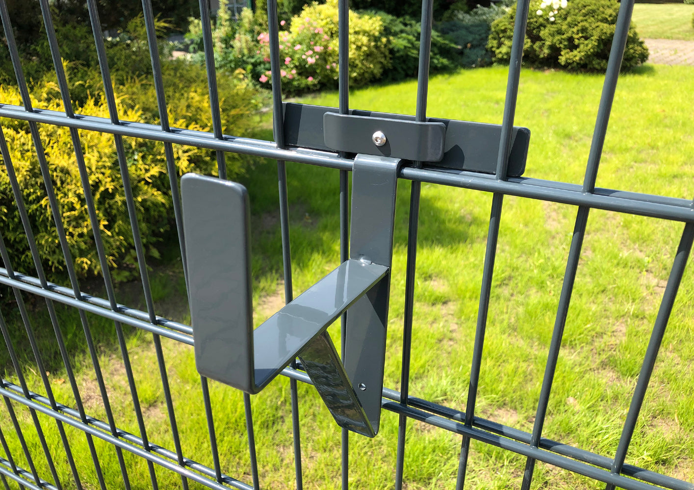 Gemaakt voor het gepatenteerd dubbelstaafmat hekwerk. Hij klem. Dit is puur staal. Geen buiging. Stevige constructie. Het is buitenwerk. De elementen doen hun best. De houder blijft. Duurzaam.
